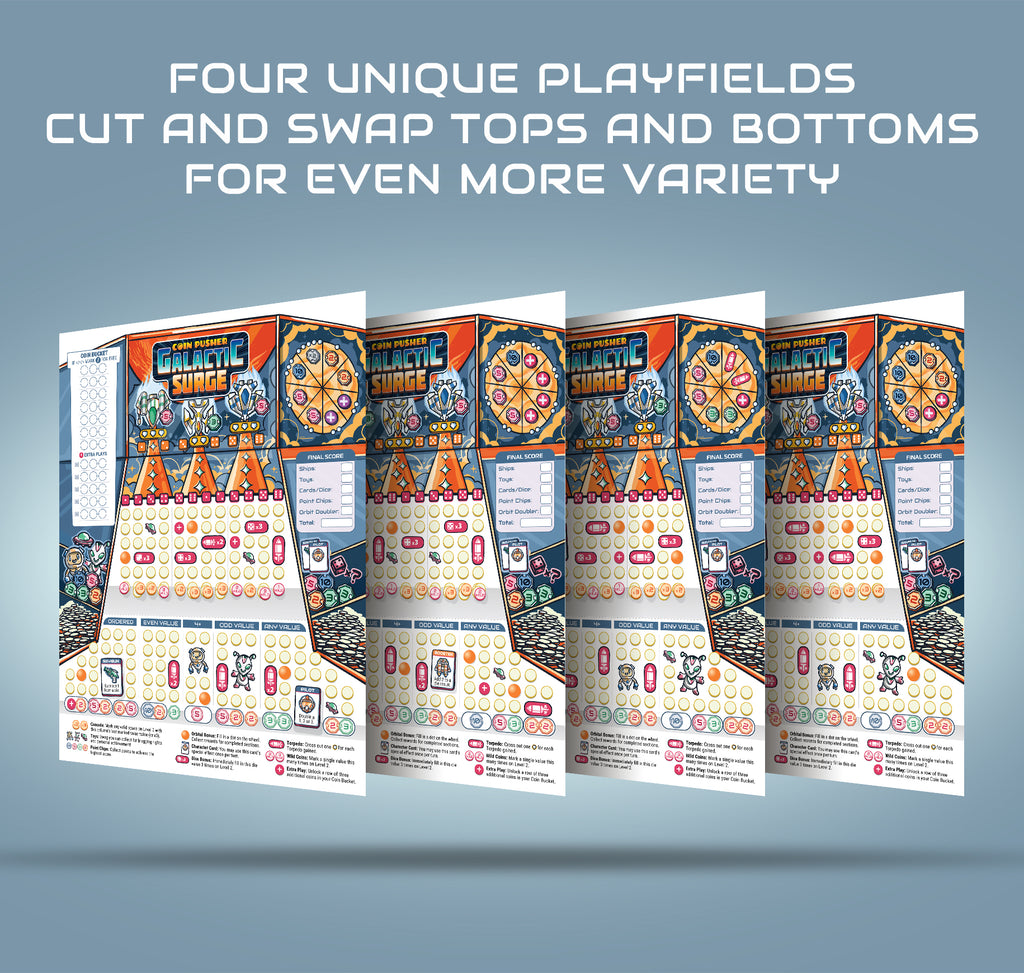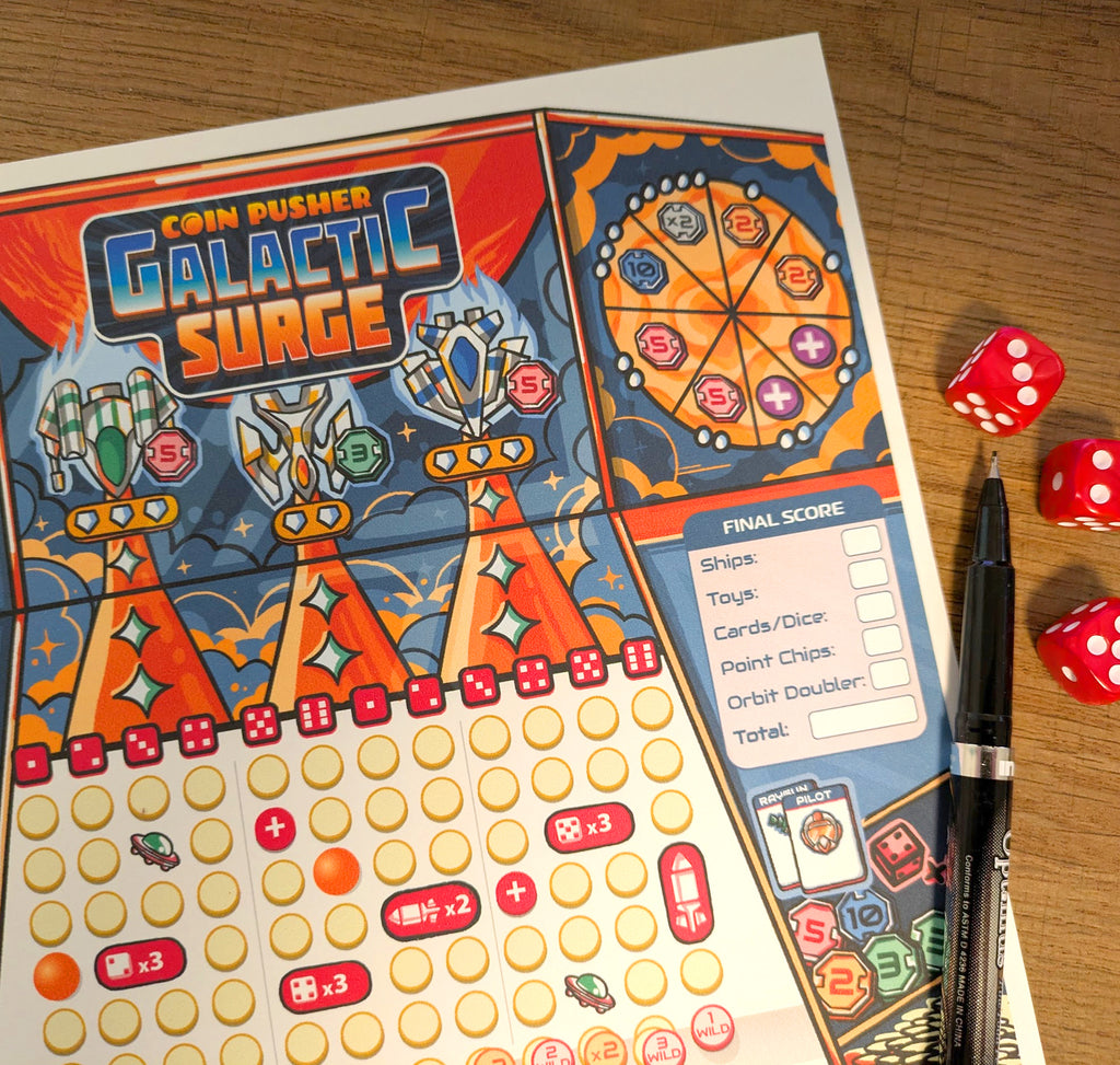 Welcome to Coin Pusher—a paper-based roll and write game series recreating the tension and excitment of real-world coin pushing arcade machines.