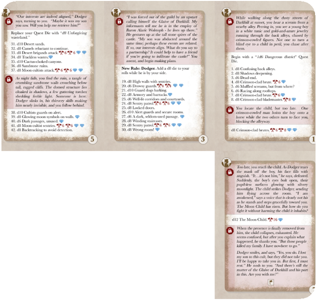Using a clever new exploration mechanic, each foray into the story will offer different challenges using a simple combination of two elements. Select two of your own traits and roll off against the two story elements, and see if you can beat the dangerous situation. If you roll well, you survive to continue on. If you fail, you will take damage. But don't despair – you can spend Stamina to re-roll dice before you apply their effects! If you can make it through the story, you win! Your score is how many treasures you manage to collect along the way – see if you can beat your high score by playing again!