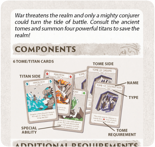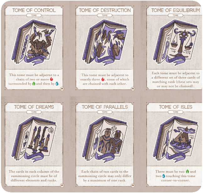 Conjurer's Tome is a solo-only expansion to the Mysticana deck. Complete summoning circles, each of which contains two tomes whose unique requirements must be simultaneously satisfied, to summon powerful titans with unique abilities. Shifting tomes create new puzzles to solve every round. Summon four titans to win!