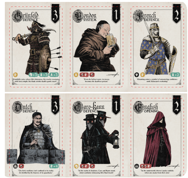 Opening Cards: Each illustrated with a fictional medieval character, representing the spirit of the respective classic chess opening. Your chosen opening sets your strategy for the round and grants unique abilities to shape your approach.