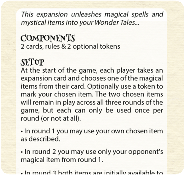 Here's the magical items expansion. At just two cards, it'll give players a variety of items to use, but there's a catch - any item that you use in round 1 is available to your opponent in the next round.