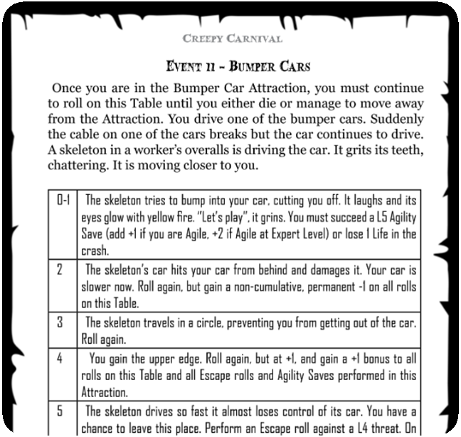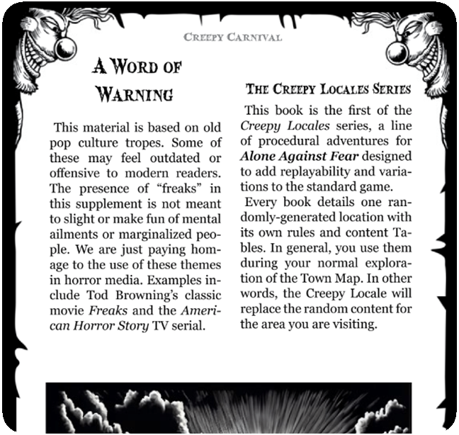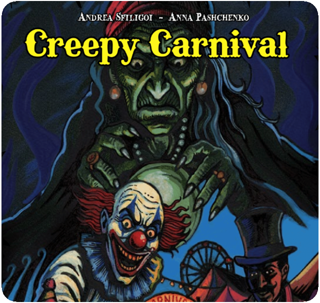 Creepy Carnival is a supplement for Alone Against Fear, detailing a haunted funfair. Suitable for all levels of play. 100 pages, black and white PDF. Written by Andrea Sfiligoi and Anna Pashchenko.