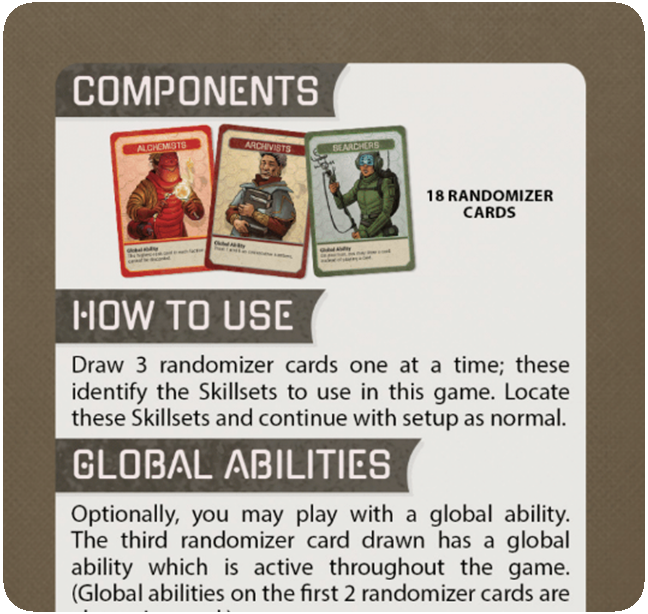 Draw 3 randomizer cards to determine the 3 skillsets to use. Optionally, you may play with the global ability on the third randomizer card drawn.
