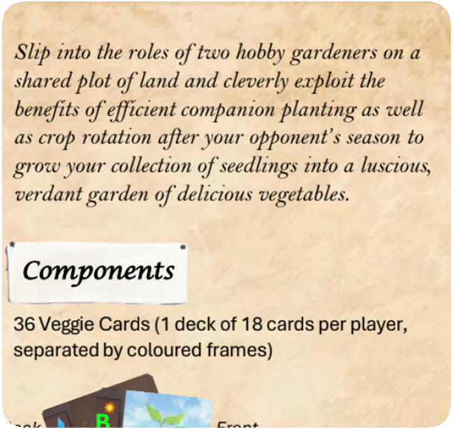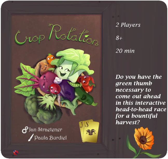 Crop Rotation is a card game that is fully playable in hand, in which two competing players slip into the roles of vegetable gardeners who share a plot of land and who both strive to outdo each other with their harvests.