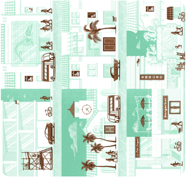 Each turn, add a new card to the growing city tableau in your hands. Connect them to your street while making sure to keep your scoring elements visible, overlapping other cards as necessary.