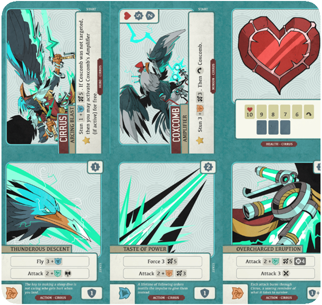 Characters are composed of 6-card sets featuring a hero card, a health tracker, and action cards. Occasionally a minion or item will replace an action card.