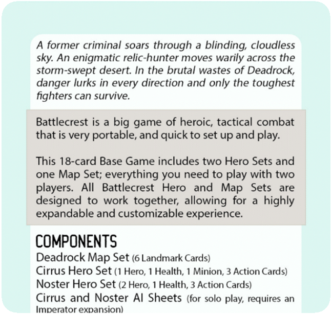 Return to the Neververse with Battlecrest: Deadrock, our third year base set. Only the toughest and most brutal fighters can survive this desolate landscape. As with Fellwoods and Metronn, Deadrock comes with a new 6-card map and two new heroes. More heroes will be added throughout the year to test their might against each other and their environment.