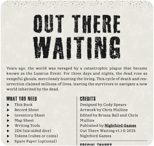 Out There Waiting is a tabletop role-playing game that explores themes of survival, sacrifice, and hope.