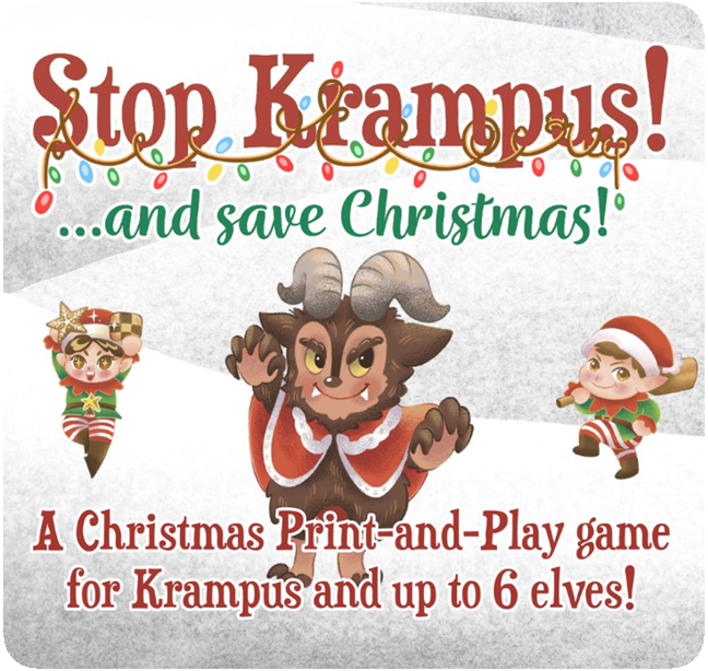 In this one-versus-many print-and-play game, one player plays as Krampus (often a grown-up, older sibling, or anyone who enjoys a bit of mischief) while the remaining players cooperate as Santa’s elves, working together to try and save Christmas! (The game also has full co-op and solo modes.)