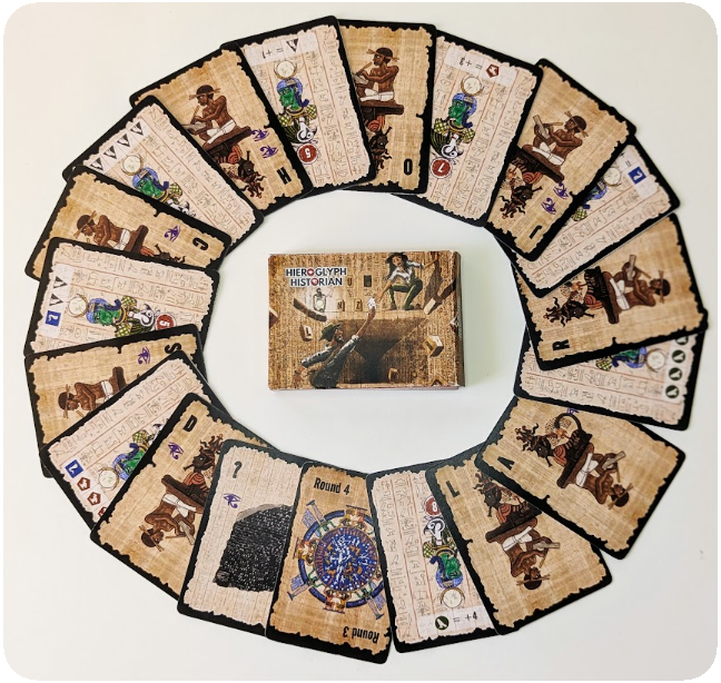 Each round contains 2 phaeses. In the Study Phase, make words in your hand to transfer cards to the table. In the Decipher Phase, make words on the table to obtain Hieroglyphs. You only have 4 rounds to get a high score and escape the tomb!